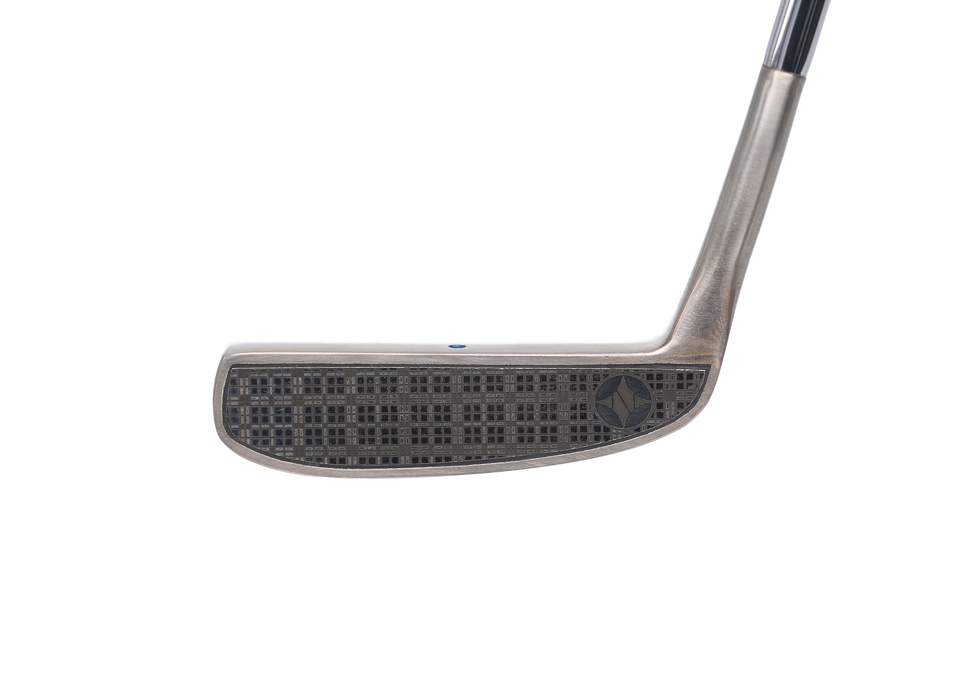 This beautiful piece features a hand polished satin finish and a laser etched face insert. These putters are 3D printed and are made of 4 different metals including a bronze/stainless Steel alloy, high density tungsten, low density aircraft grade aluminum, as well as 303 stainless steel. The result is a putter with a significantly higher MOI around 25% higher than a normal blade putter. This is brand new and never used.