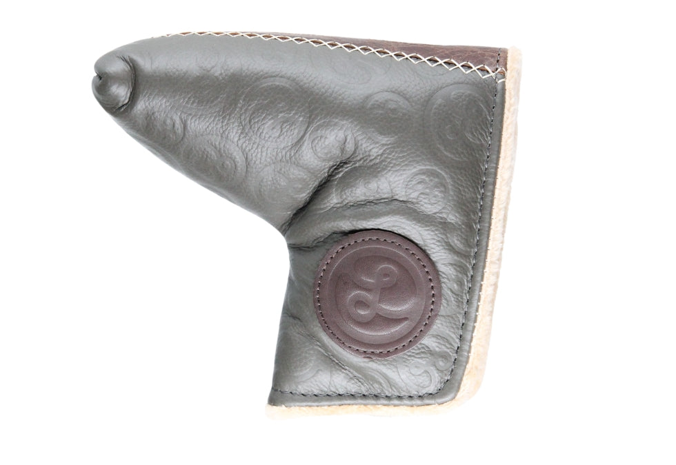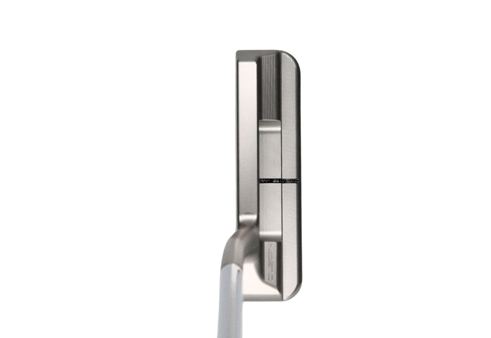 This putter has nearly full toe hang and 1/2 offset. This beauty was finished off with a chrome stepless shaft and an extremely tacky Grip Master Leather grip. It is currently set to 35" and comes with the Olson leather headcover pictured. We can bend this to spec so please let us know if you would like it bent otherwise we will assume standard specs, 69* and 3*. -