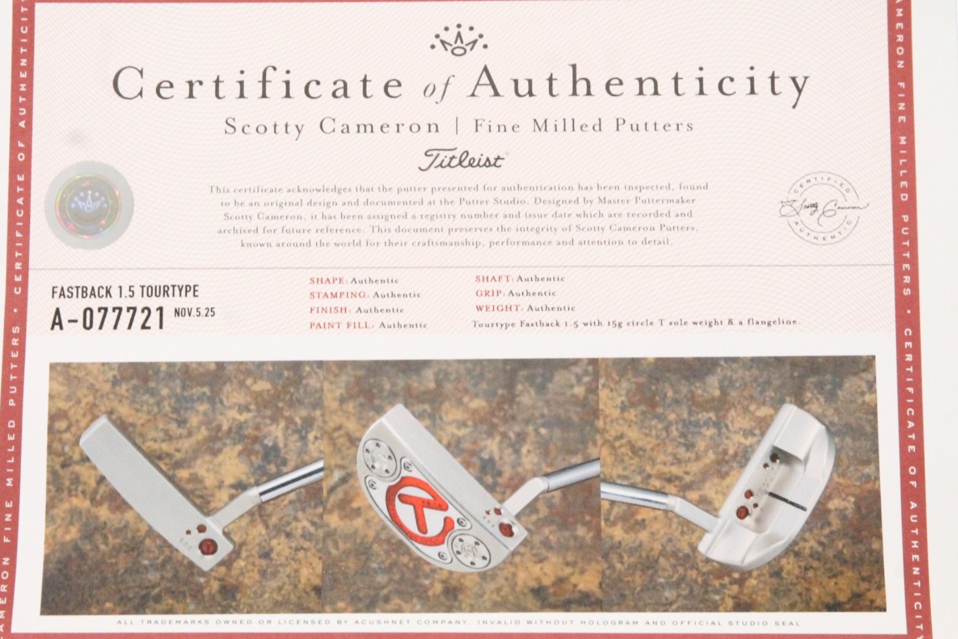 This tour only Scotty Cameron Circle T Tour Fastback putter features a flange line and 10g Circle T weights. This piece is like new, 9 out of 10.