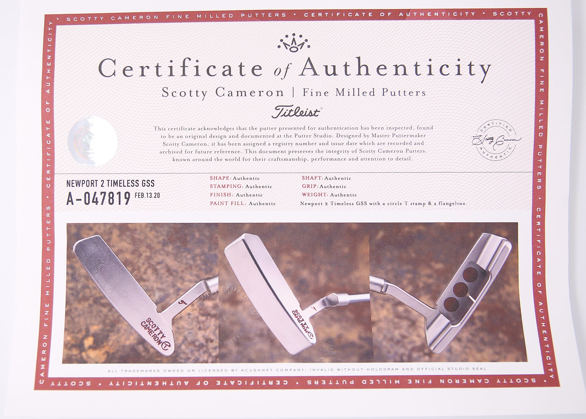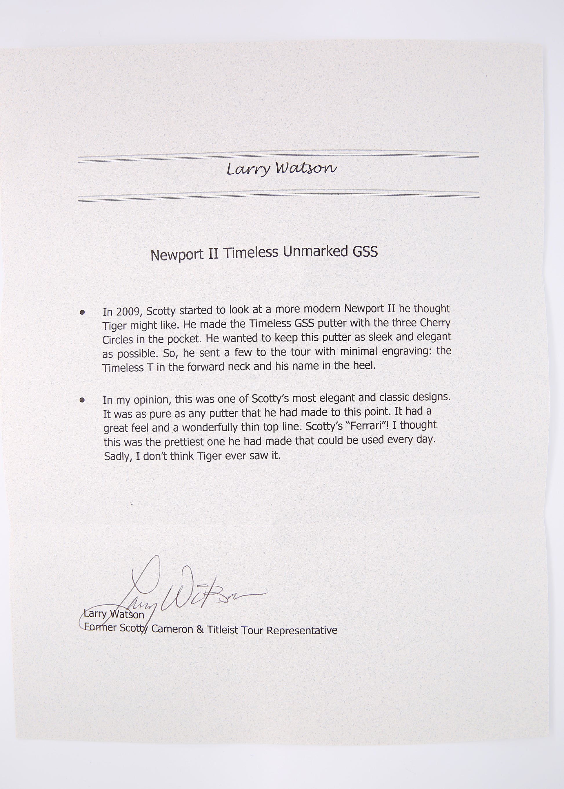 This one of a kind Scotty Cameron Circle T Newport 2 Timeless is made entirely of GSS. This putter features a highly sought after T stamp on the front of the neck. This putter also features a flangeline and tour blank sole. This putter was made for Tiger Woods and includes the note from Larry Watson which verifies that claim. This putter is mint condition 9.9 only due to some light brushing on the sole and a small mark where the tour department bent this putter to sit slightly open which is also shown on the COA.