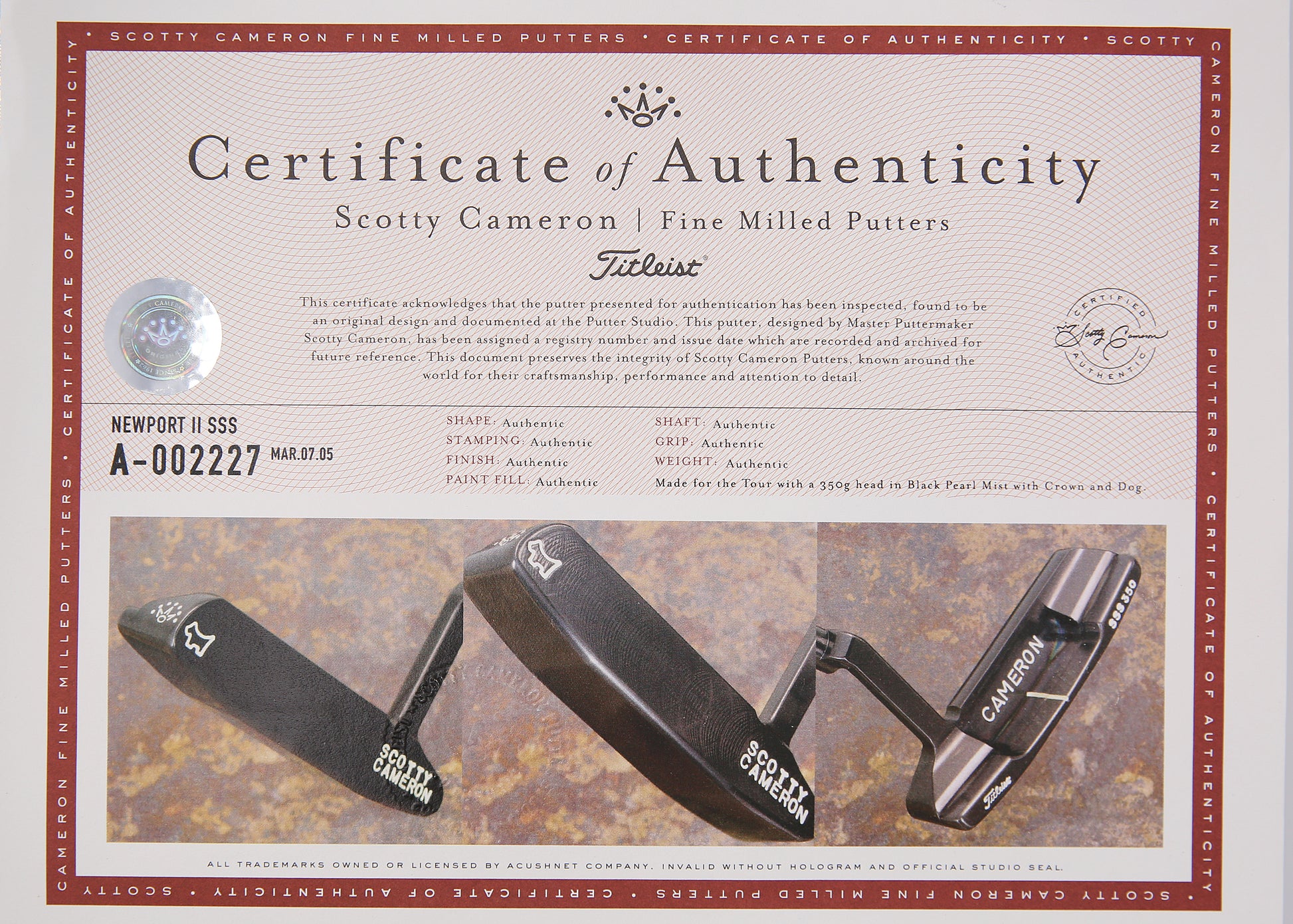 This stunning Scotty Cameron Newport 2 putter is finished in a super rare black pearl mist finish. This putter features a 350g headweight, tour blank, tri sole, flange line, crown stamp on the extreme toe and a scotty bull dog on the face. This is in good used condition, 8 out of 10.