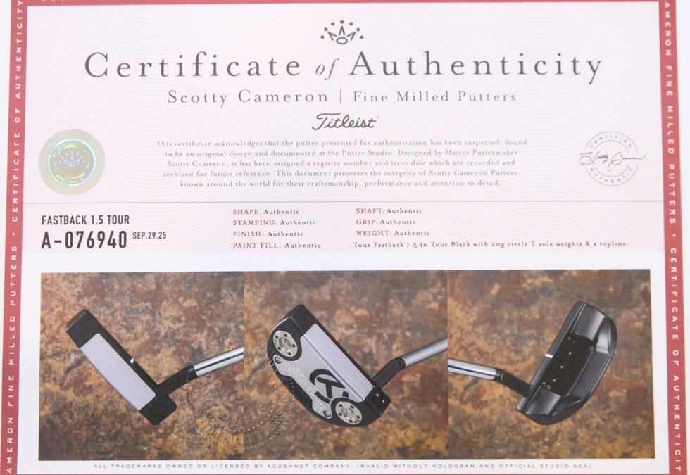 This tour only Scotty Cameron Circle T Tour Fastback putter features a Tour Black SSS Body with Silver Anodized Aluminum Core, top line and 10g Circle T weights. This piece is new, never used.