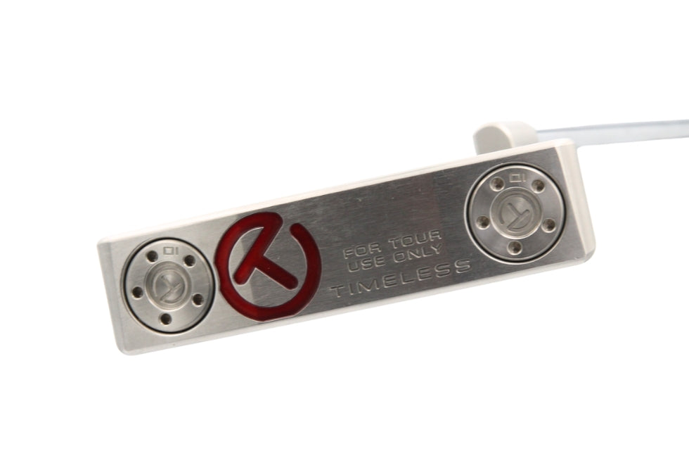 This Scotty Cameron Circle T Tourtype Timeless SSS putter features a newly redesigned Timeless head with a plumbers neck, top line, and two 10g Circle T weights. This is used 8.5 out of 10, just some light brushing on the sole.