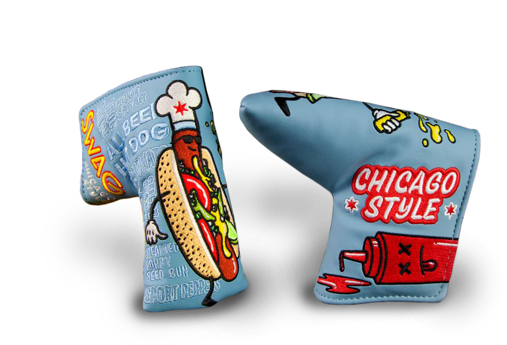 A true Chicago Style hot dog is topped with yellow mustard, chopped white onions, bright green sweet pickle relish, a dillpickle spear, tomato wedges, pickled sport peppers and a dash of celery salt. Don't even think about ketchup!!! The complete assembly is then placed on steamed poppy seed bun. These covers don't taste as good a real Chicago Dog, but they sure look as good. This headcover is new and in the plastic.